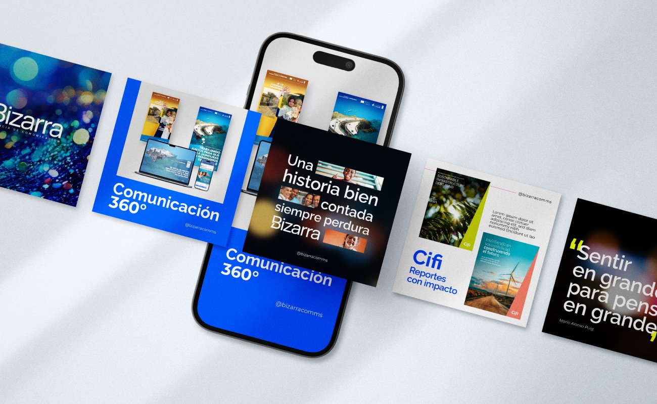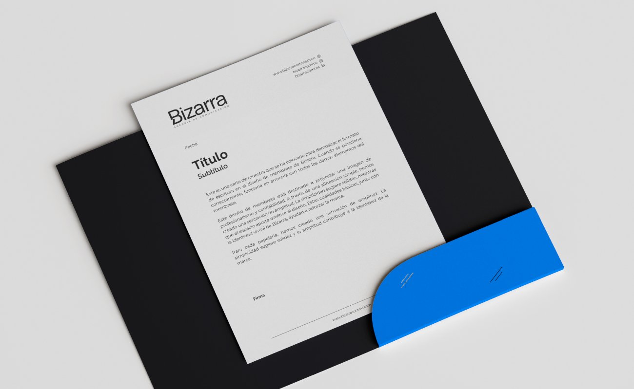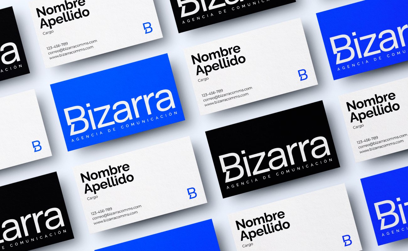Visual identity and branding for Bizarra, a Panama-based communications agency with a creative and modern focus. The logo proposes a clean and minimalist aesthetic that prioritizes the agency’s bold character.