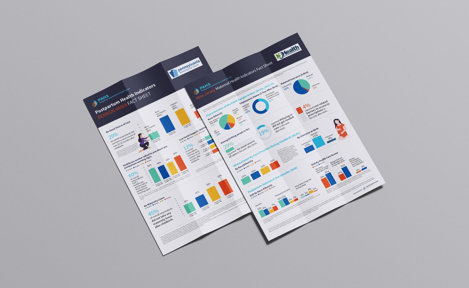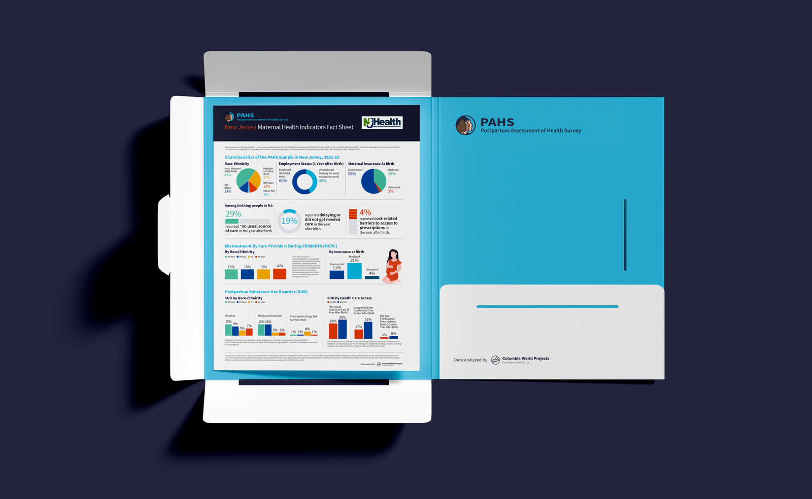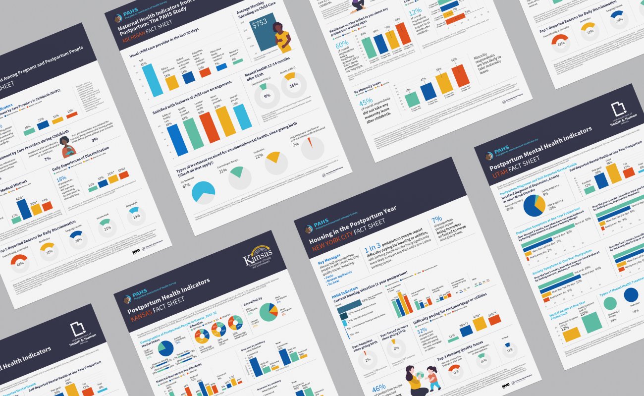 A series of editorial fact sheets designed to clearly communicate key findings from the Postpartum Assessment of Health Survey (PAHS). The project focuses on translating rigorous research data into accessible, well-structured visuals for health professionals and academic audiences, while adhering to Columbia University’s institutional identity.